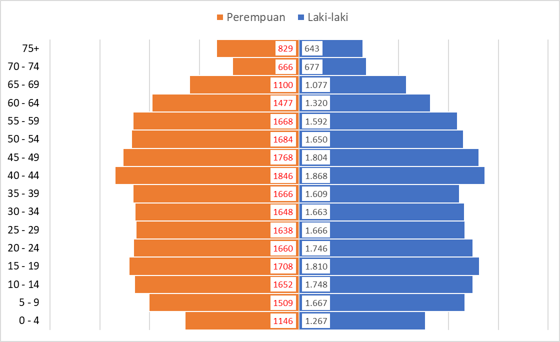 Berdasarkan piramida penduduk wilayah kerja UPTD Puskesmas Sewon I pada Semester II Tahun 2025, terlihat bahwa komposisi penduduk didominasi oleh kelompok usia produktif (15–59 tahun). Kondisi ini memberikan peluang strategis bagi penguatan program pemberdayaan masyarakat, peningkatan kualitas SDM, serta pengembangan pelayanan kesehatan promotif dan preventif yang menyasar kelompok usia produktif sebagai motor penggerak keluarga dan masyarakat.
