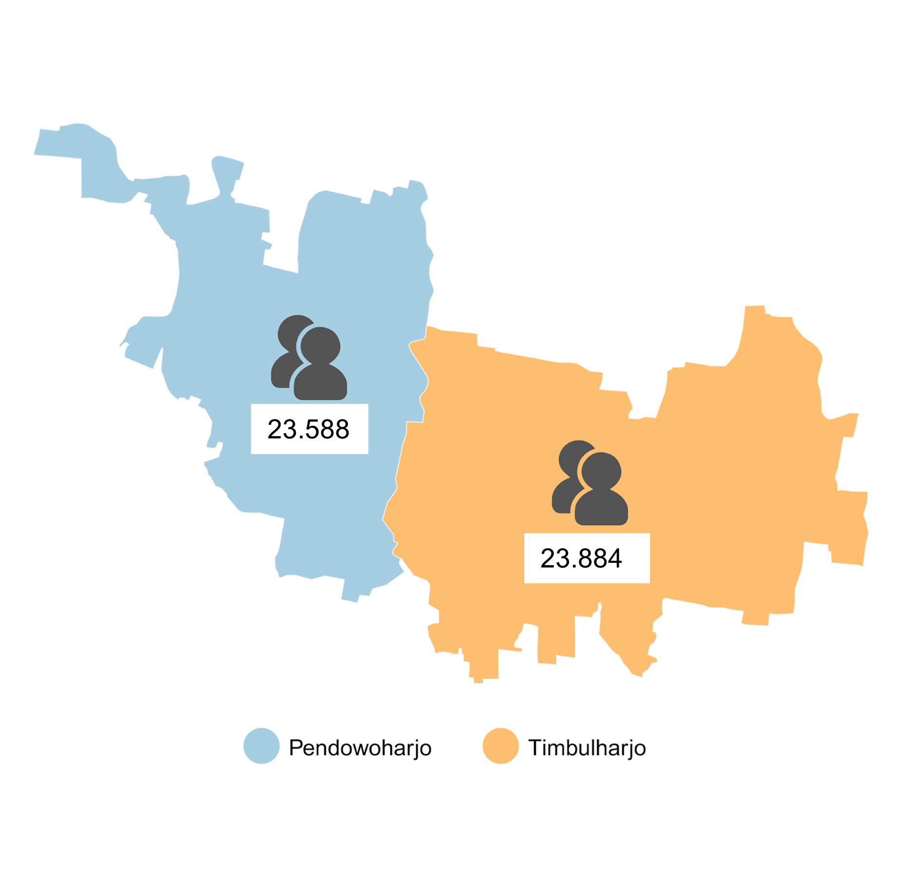 Gambar 2 menunjukkan jumlah penduduk di wilayah kerja Puskesmas Sewon I, jumlah penduduk di Klaurahan Timbulharjo tercatat sebanyak 23.884 jiwa, sementara jumlah penduduk di Kalurahan Pendowoharjo sebanyak 23.588 jiwa. Data ini menjadi dasar dalam menentukan kebutuhan sumber daya kesehatan, seperti jumlah tenaga kesehatan, ketersediaan sarana dan prasarana, serta logistik pelayanan kesehatan.