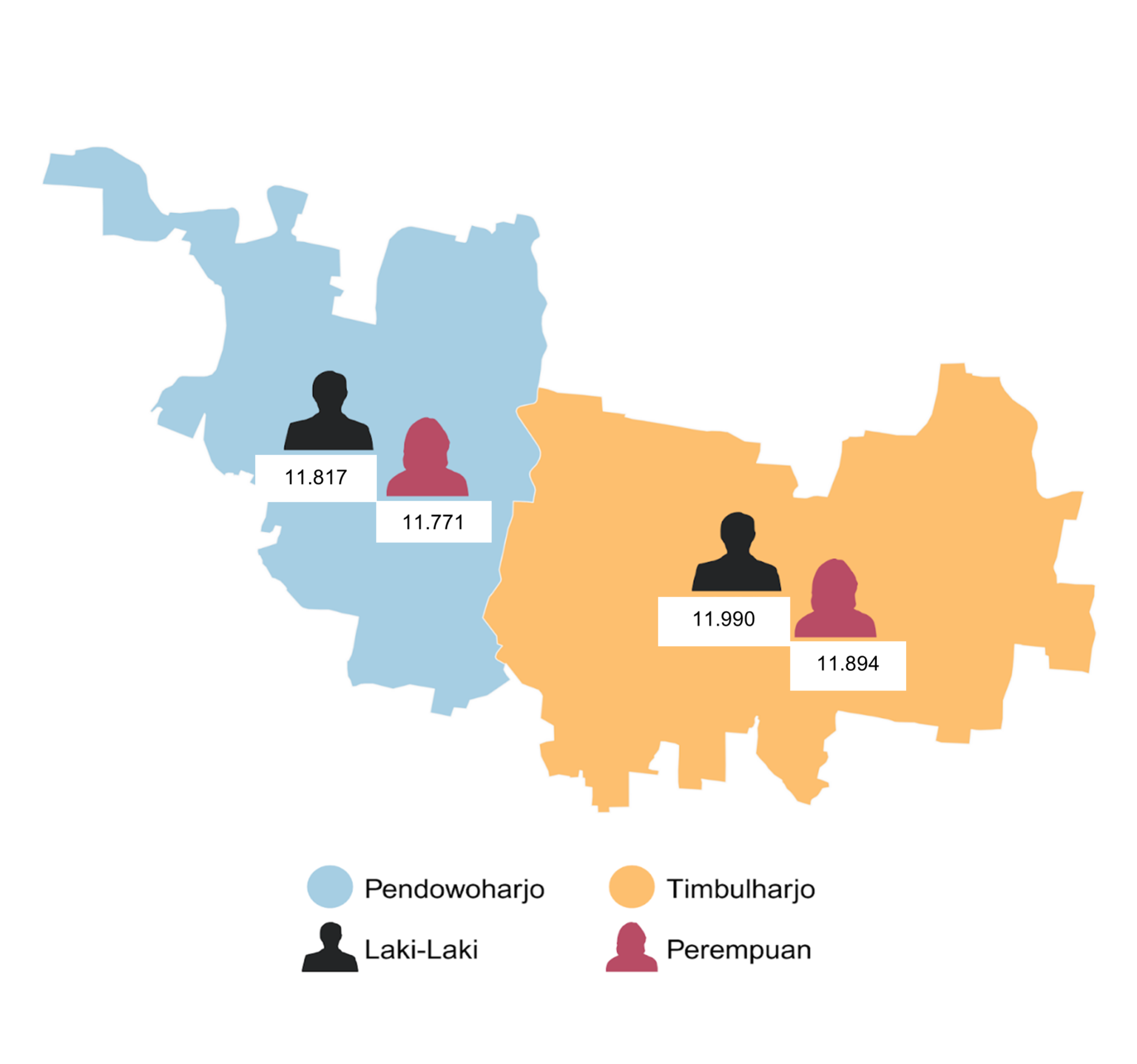 Gambar 3 di atas menyajikan peta distribusi penduduk berdasarkan jenis kelamin di dua wilayah kalurahan, di wilayah Pendowoharjo, jumlah penduduk laki-laki tercatat sebanyak 11.817 jiwa, dan perempuan sebanyak 11.771 jiwa. Sementara di Timbulharjo, jumlah penduduk laki-laki adalah 11.990 jiwa, dan perempuan 11.894 jiwa. Dengan mengetahui distribusi jenis kelamin, puskesmas dapat menyesuaikan penyediaan layanan kesehatan, baik yang bersifat preventif dan kuratif termasuk aspek promosi kesehatan seperti pelayanan kesehatan ibu dan anak, kesehatan reproduksi, serta skrining penyakit tertentu yang berkaitan dengan jenis kelamin.